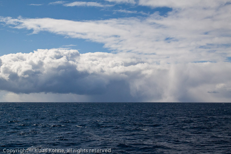 Mischung aus sonnigem Wetter und fernen Regenwolken über der ruhigen Drake Passage