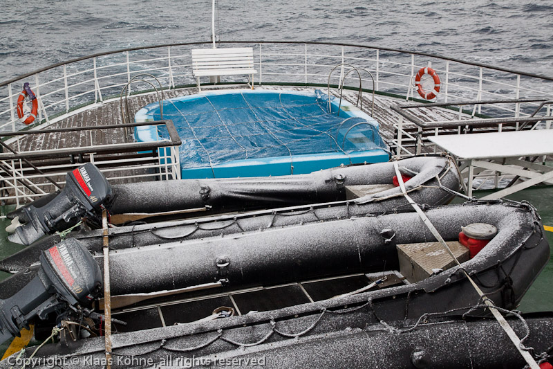 Reif auf den Schlauchbooten und dem Pool am Heck der "Lyubov Orlova"