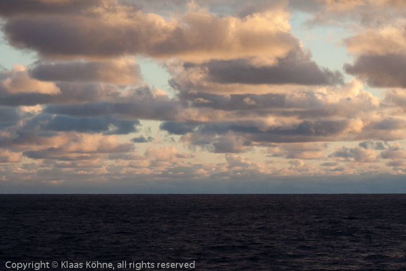 Schicht aus Haufenwolken am Abend über der südlichen Drake Passage bei ruhiger See.