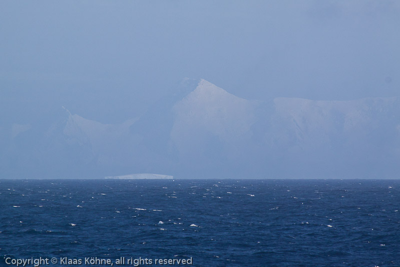 Die schneebedeckten Berge von Livingstone Island im Dunst bei der Anfahrt von Norden mit flachem Eisberg im Vordergrund.