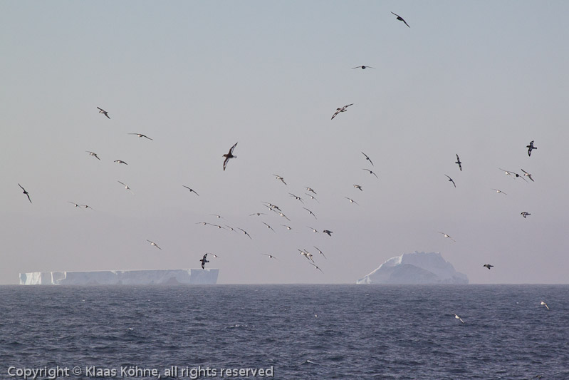 Kapsturmvögel (Daption capense) und antarktische Sturmvögel (Thalassoica antarctica) vor Eisbergen bei den Aitcho Islands.