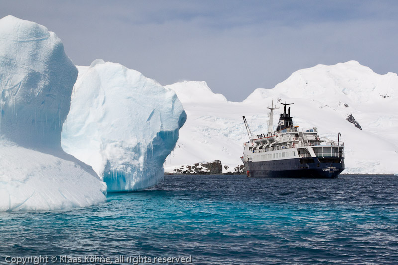 Vom Schlauchboot aus aufgenommene Eisberge mit der "Lyubov Orlova" und den Schneebergen von Livingstone Island im Hintergrund.