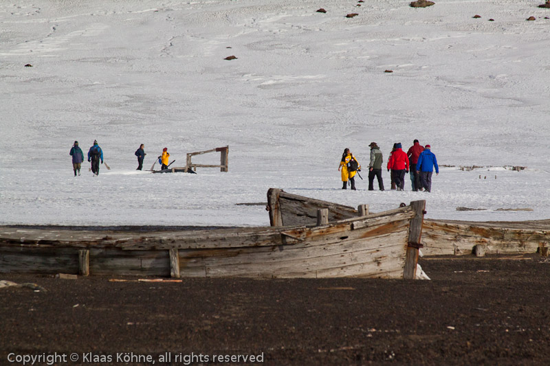 Touristen im Schnee von Deception Island mit den Resten alter Walfangboote aus Holz im Vordergrund.