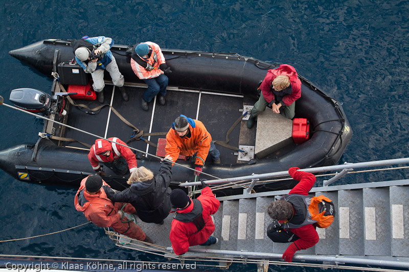 Touristin beim Einstieg in ein Schlauchboot mit weiteren Touristen und Matrosen. Aufnahme von oben.