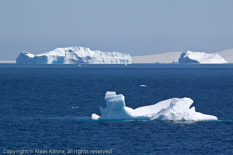 Teleaufnahme einer Gruppe von drei Eisbergen in der Gerlache Strait.