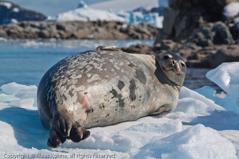 Wedellrobbe (Leptonychotes weddelli) auf einer Eisscholle mit Blick zur Kamera.