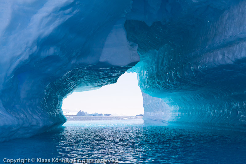 Tunnel eines großen, blauen Eisberges in Nahaufname.