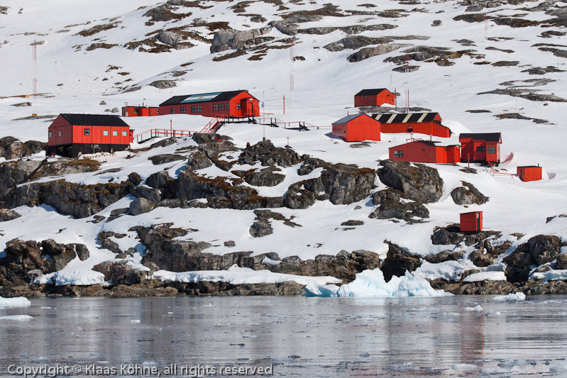Rote Gebäude der argentinischen Station "Primavera" auf verschneiter Felslandschaft.