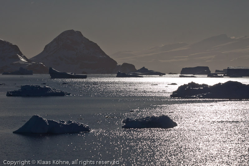 Eisberge und Gipfel in der Hughes Bay im Gegenlicht mit Sonnenreflexen auf dem Wasser.