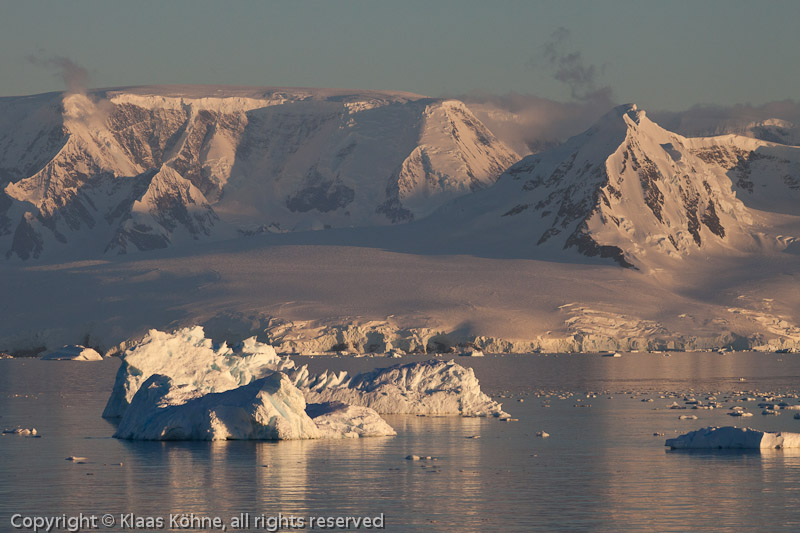 Gletscherberge der Antarktischen Halbinsel im Abendlicht mit Eisbergen im Vordergrund.
