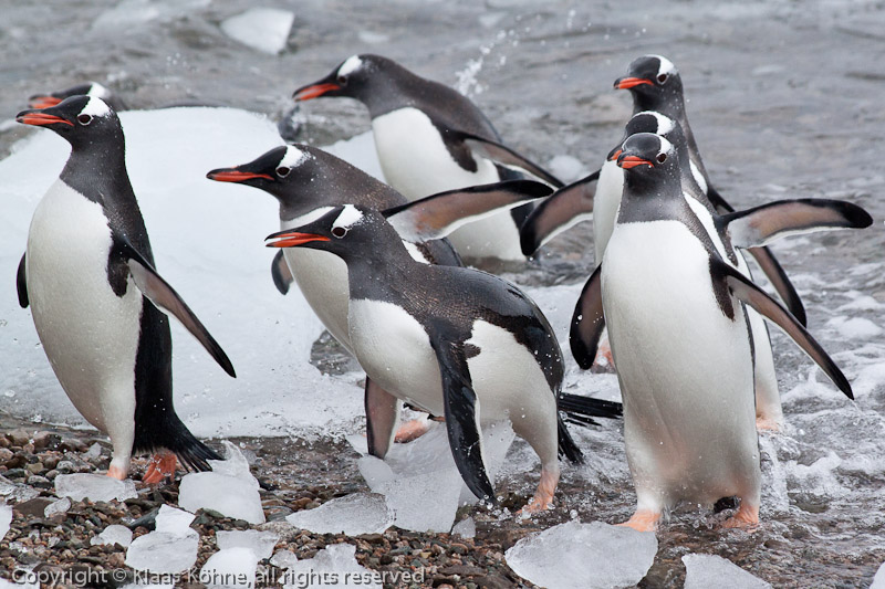 Gruppe von Eselspinguinen (Pygoscelis papua), die gerade das Wasser verlassen, am Ufer mit Eisbrocken.