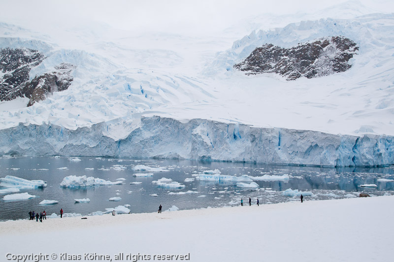 Blick von einem Hügel auf die Gletscher von Neko Harbour, mit einigen Touristen im Vordergrund.