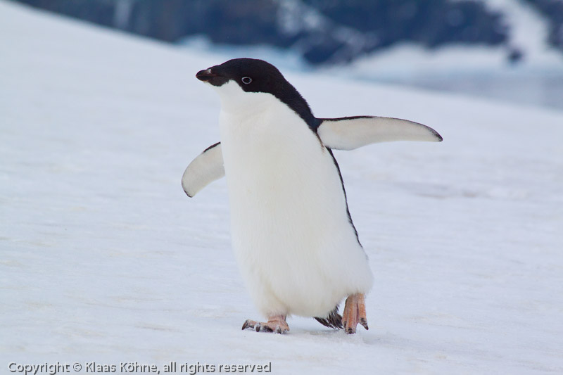 Einzelner adulter Adeliepinguin (Pygoscelis adeliae) auf Schneeboden.