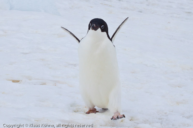 Einzelner Adeliepinguin (Pygoscelis adeliae) auf Schneeboden mit erhobenen Flügeln.