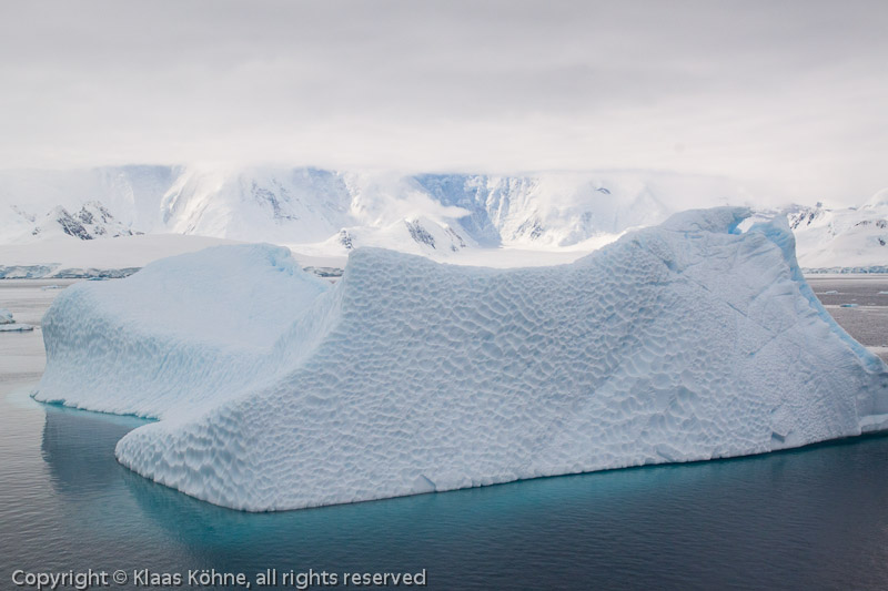 Umgestürzter, pockennarbiger Eisberg im Neumayer Channel mit tief hängender Wolkendecke und Schneebergen im Hintergrund.
