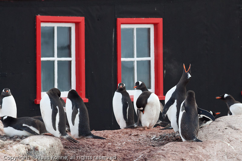 Gruppe von Eselspinguinen (Pygoscelis papua) vor den roten Fenstern des Bransfield House in Port Lockroy. Ein Pinguin in Rufhaltung, ein anderer brütend.