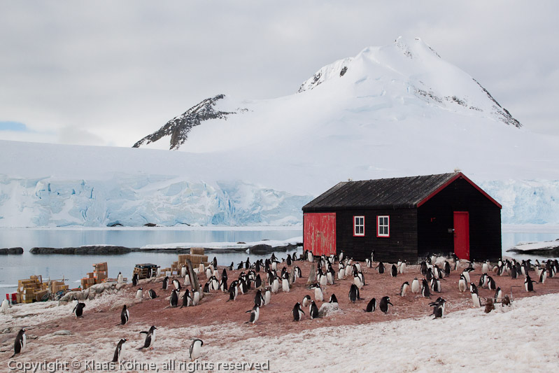 Kolonie von Eselspinguinen (Pygoscelis papua) vor dem Goudier House in Port Lockroy mit schwarzen Wänden und roten Türen, Gletscher und Schneeberg im Hintergrund.