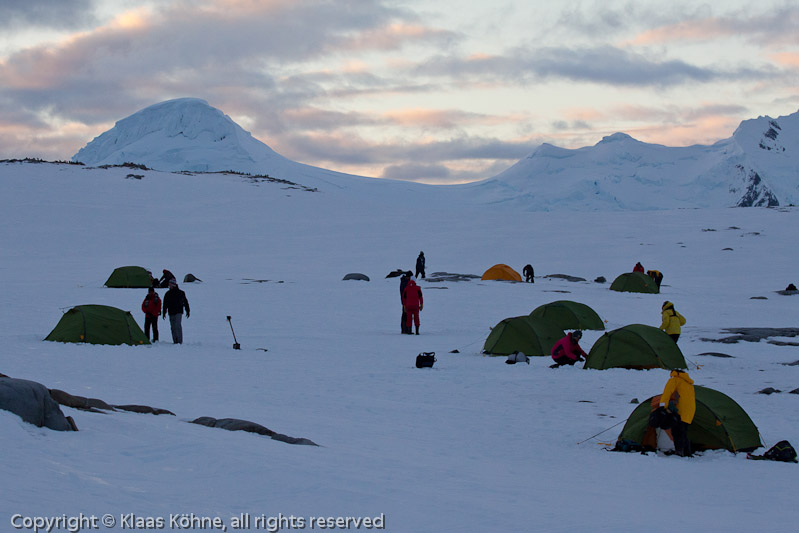 Gruppe von Zelten in Dorian Bay bei Port Lockroy in der Abenddämmerung.