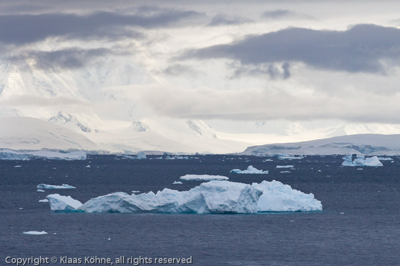 Neumayer Channel mit wolkenverhangenen Schneebergen im Hintergrund und größeren Eisbrocken im Vordergrund.