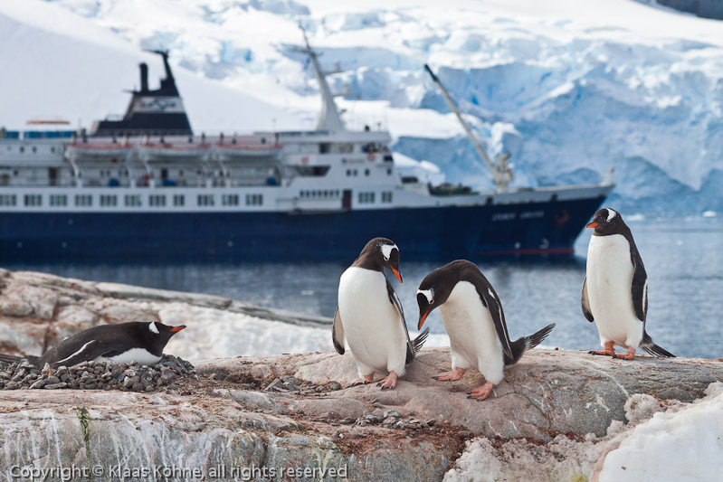 Gruppe von vier Eselspinguinen (Pygoscelis papua) vor der "Lyubov Orlova" mit einer Gletscherwand im Hintergrund. Drei Pinguine stehend, einer brütend.