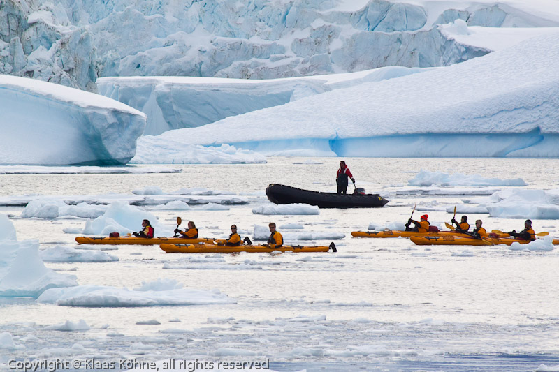Gruppe von vier Doppelkajaks und einem Motorschlauchboot zwischen Eisbrocken vor einer Gletscherwand.