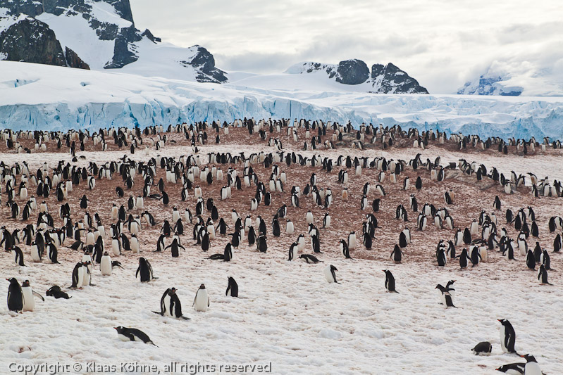 Große Kolonie von Eselspinguinen (Pygoscelis papua) auf Cuverville Island vor Bergen und einer breiten Gletscherfront.