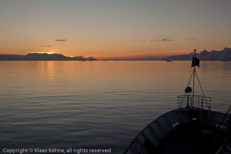Sonnenuntergang über der Antarktischen Halbinsel. Vielleicht werden wir morgen den Kontinent betreten.
