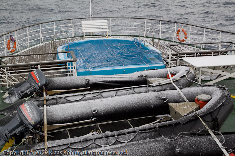 Reif auf den Schlauchbooten. Wir sind eben nicht in der Karibik unterwegs. Deshalb wird der Pool wohl auch geschlossen bleiben...