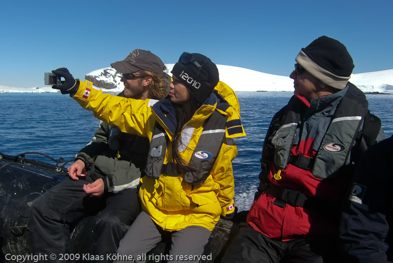 Im Schlauchboot: Christina, unsere quirlige kleine Kanadierin, eingerahmt von einem Brasilianer und einem US-Amerikaner.
