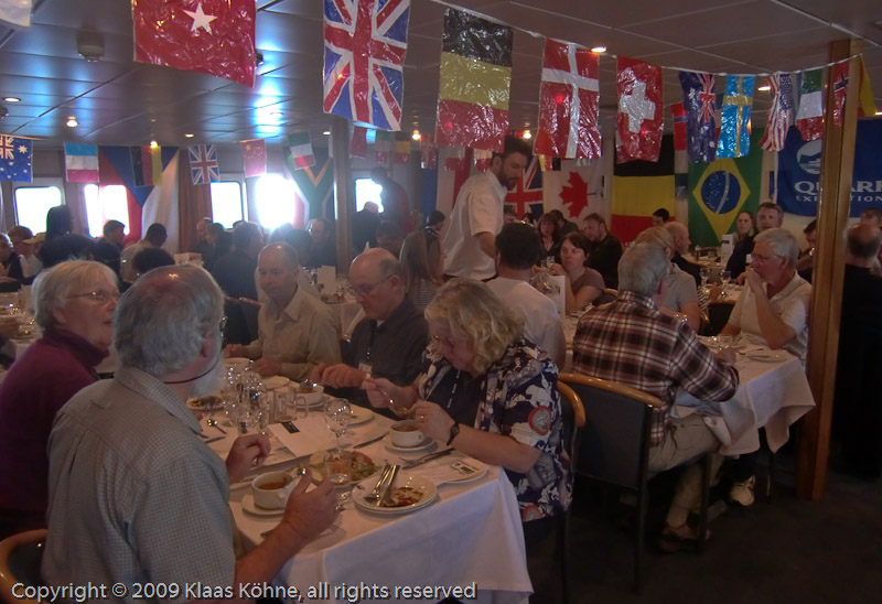 Und wieder lecker essen. Heute ist "International Dinner" mit den Flaggen aller Passagier-Länder. Die deutsche Flagge (hinten) hängt nur wegen mir...