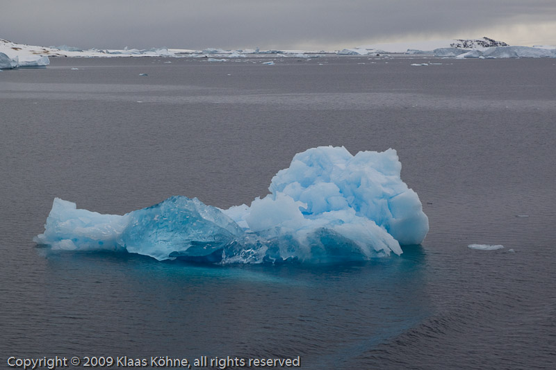 Ein umgekippter Eisberg zeigt uns seine intensiv blaue Unterseite.