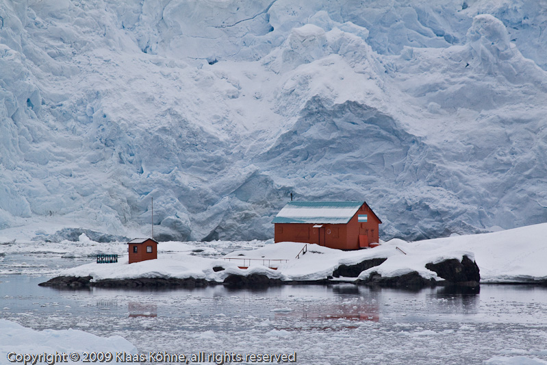 Nebengebäude vor einer Gletscherwand. Die argentinische Flagge passt gut zum Ambiente.