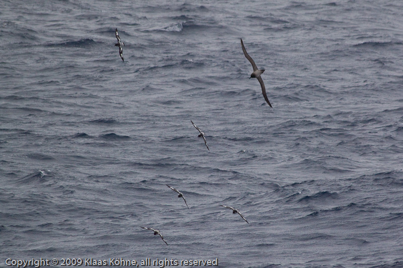 Hier im Formationsflug mit einem "Light mantled sooty albatross" (Phoebetria palpebrata), kurz "Sooty" genannt. Diese Sorte haben wir auf der Hinfahrt nicht gesehen.