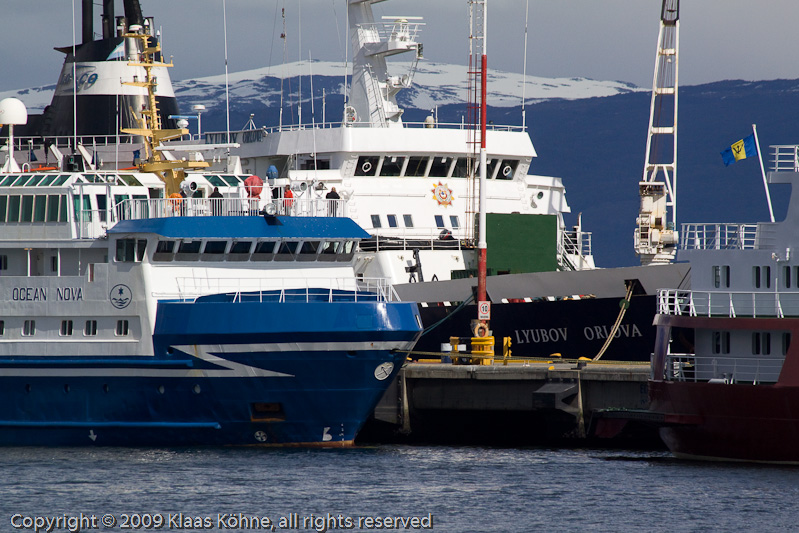 Vor die Tür: Da ist die Orlova, zusammen mit zwei anderen Antarktis-Schiffen. Die kommende Fahrt ist ausgebucht, aber wenn mich jetzt jemand fragen würde "Kommst du nochmal mit?", wäre ich wohl zu einigen finanziellen Dummheiten bereit...