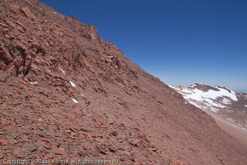 Hier geht´s irgendwie nicht vernünftig weiter. Die Spur versickert. Nach einigen Irrgängen entscheide ich mich für den direkten Aufstieg zum Grat.