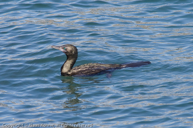 Ein Kormoran mit leuchtend grünen Augen schwimmt vorbei und schaut sich das Spektakel an.