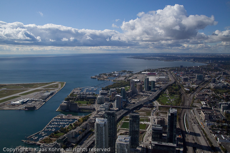 Blick nach Westen. Links unten Yachthafen und City-Airport.