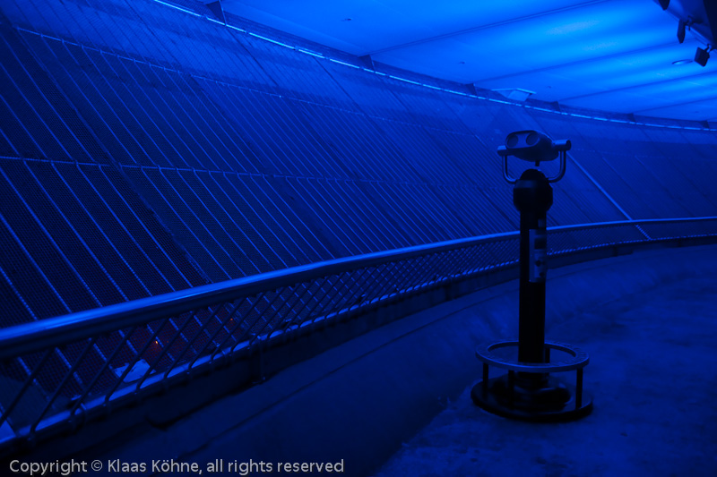 Ich riskier´s und gehe mal nach draußen. Wegen der nächtlichen Lightshow des Turms mit ständig wechselnden Farben ist es ein wenig surreal hier oben. Aber auch faszinierend. Auf jeden Fall ganz schön frisch...