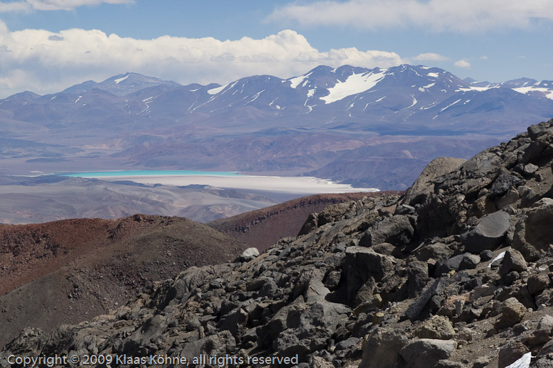 Um halb vier erreiche ich den Sattel auf 6537m. Es beginnt der Schlussanstieg. Es windet heftiger - bitte nicht! Noch 121 Höhenmeter, das muss doch zu schaffen sein... Gegenüber ist der Pissis aufgetaucht, mit 6795m der dritthöchste Berg von ganz Amerika. Davor die hübsche Laguna Verde. Da möchte ich irgendwann auch mal hin.