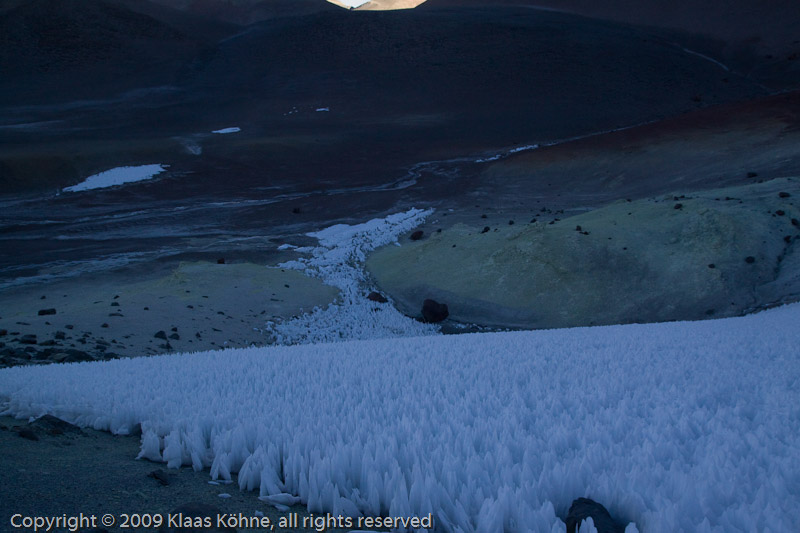 Ich nehme aus purer Neugierde auch im unteren Teil einen anderen Hang als beim Aufstieg. Der beschert mir aber ´nen ziemlichen Umweg und ein paar zusätzliche Höhenmeter. Ich sollte mir langsam abgewöhnen, beim Abstieg von 6000ern neue Routen zu erkunden...