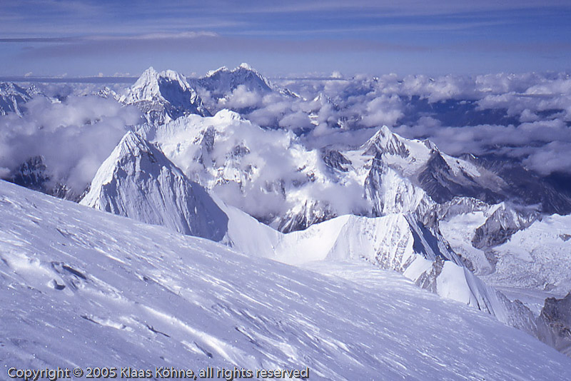 Blick nach Südwesten zur Pyramide des Nangpai Gosum und zum Gaurishankar dahinter. Das sind beides Siebentausender. Und ich bin deutlich höher - unglaublich! Es geht nach links zu nächsten Hang. Ein Sherpa sagt, noch 3-4 Stunden! Oh Mist, ich dachte weniger. Egal, rauf! H.R. kommt runter (mit blödem Spruch), dann M.S., dann C.S. und D.G.. Es ist elf Uhr, ich soll runter! Wir sind auf etwa 7900-8000m. Och nö! Ich kann mich zum Glück durchsetzen. Das Wetter ist toll und ich fühle mich gut - also weiter! Zum Glück lässt man mich machen...