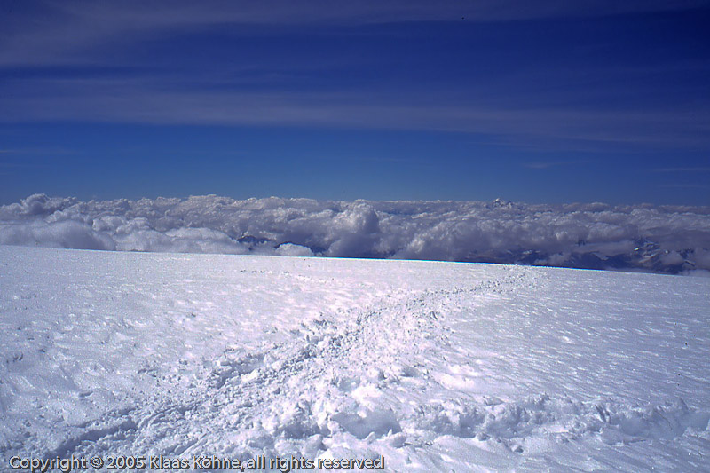 So, jetzt aber zügig abwärts. Das Wetter hält offenbar. Obwohl ich mich ja durchaus noch in einer riskanten Situation befinde (alleine auf 8100m, die nächsten Menschen rund 800m tiefer) bin ich doch überzeugt, dass ja jetzt eigentlich nichts mehr schief gehen kann, wenn ich keinen Mist baue. Am liebsten würde ich mit Zeit lassen und das Ambiente genießen, aber ich habe Angst vor dem Gruppen-Donnerwetter, das weiter unten auf mich wartet, wenn ich mich nicht beeile. Außerdem mache ich mir Sorgen, wie ich am Gelben Band zurechtkomme. Vorher ist noch keine Entwarnung. Zack, zack über das Plateau aber ohne Verschnaufpausen geht’s nicht. Außerdem will ich wenigstens ein paar Fotos machen. Im Kopf keine großen Gefühle aber bei klarem Verstand. Auch keine Kopfschmerzen, keine Übelkeit, kein Schwindel oder was man sonst so liest. Auch nicht völlig am Ende. Kann gar nicht glauben, dass ich hier mitten durch die vielbeschworene Todeszone latsche. Vielleicht war mein grottenlangsames Aufstiegstempo gerade richtig...
