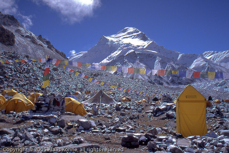 Unsel Lager ist größer geworden. Insbesondere haben wir jetzt ein Duschzelt (rechts) und es wurden Leinen mit Gebetsfahnen aufgespannt. Ganz links steht mein Zelt.