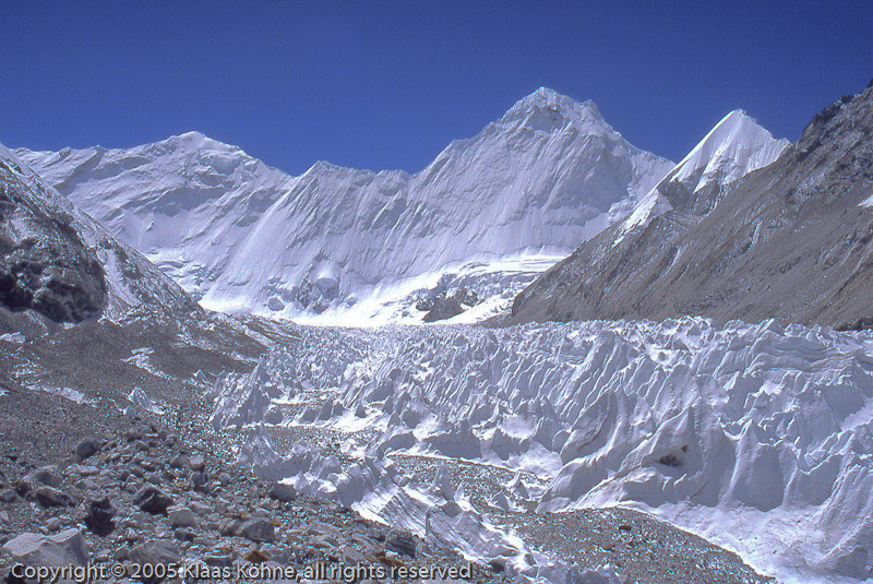 11.9.: Heute steht wieder ein "Load Carry" zum Lager 1 an. Mit ziemlich schwerem Rucksack geht es bei perfektem Wetter auf der mittlerweile bekannten Strecke wieder auf den Nangpai Gosum zu. Natürlich mit Pausen am Serac-Stopp und am Lagunen-Stopp.