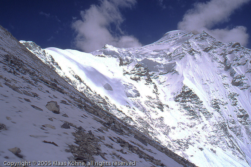 13.9.: Zum dritten Mal den Killerhang hoch. Da fragt man sich schon, ob man sein Leben gerade richtig lebt. Zumal man hier für jeden Tag ungefähr 200 Euro bezahlt hat. Rechts wieder die KH-Spitze und gleich links daneben die Gipfelregion des Cho Oyu. Ich brauche wieder knapp zwei Stunden bis zum Lager 1, in dem wir heute zum ersten Mal übernachten werden. Leider nicht im Einzelzelt. Ich werde weisungsgemäß mit H.R. ein Zelt beziehen. Das wird kein Spaß. Die "Kopfmusik" besteht heute unter anderem aus "Big World" von Joe Jackson und "Stairway to heaven" von Led Zeppelin. Passt irgendwie beides...