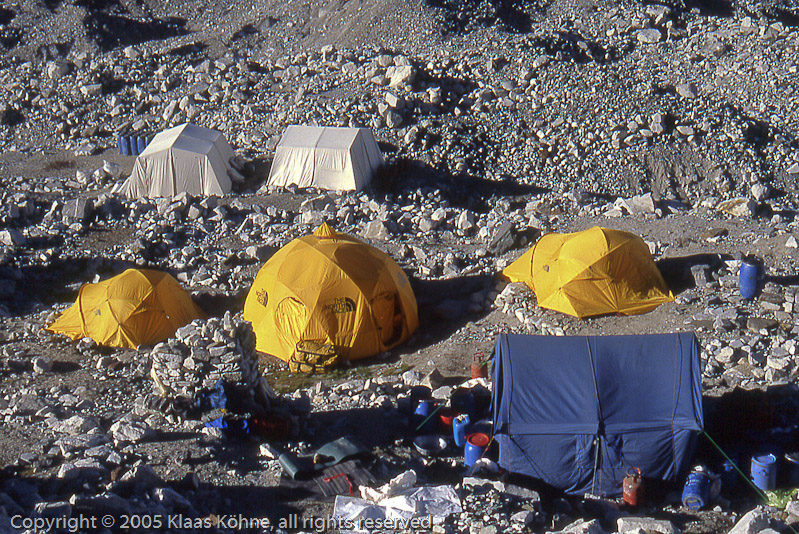 Der Rest des Tages ist frei. Schließlich müssen sich unsere Körper noch von der gestrigen Tour zum Lager 1 erholen. Ich bummle ein bisschen durch´s Lager und halte hier und dort ein Pläuschchen. Hier ein Blick auf die Zelte vom offiziellen "The North Face"-Team, die eine Skiabfahrt vom Cho Oyu versuchen wollen. Zwei Mädels und zwei Jungs, alle sehr nett. Vielleicht sehe ich sie ja demnächst mal in einem TNF-Katalog wieder.