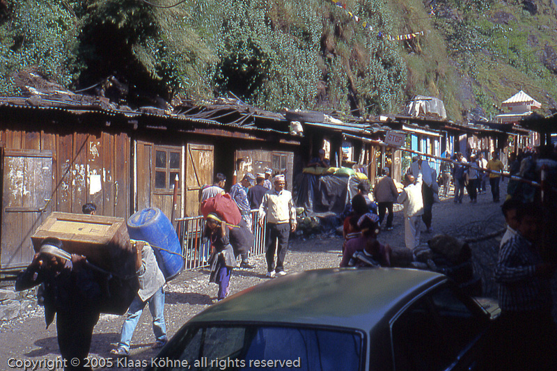 Im nepalesischen Grenzort Kodari herrscht rege Aktivität. Das sind unsere Sachen, die da per Träger vom chinesischen Truck zum wartenden nepalesischen Fahrzeug gebracht werden. Man beachte den Schlagbaum. An mehreren Kontrollposten vorbei geht es nach Kathmandu, wo wir am Nachmittag ankommen. Kam mir das Hotel Shangri La schon bei der Hinreise reichlich nobel vor, so scheint es mir jetzt geradezu palastartig. Aber mein Widerstand gegen diesen Luxus hält sich in Grenzen, in engen Grenzen...