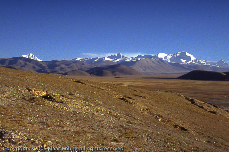 Danach gehe ich mit E.B. auf einen Aussichtshügel vor der "Stadt". Nachdem wir ein paar nervige Dorfkinder losgeworden sind, können wir unseren Blick ungestört der Haupkette des Himalaya zuwenden. Ganz rechts die mir mittlerweile so vertraute Pyramide des Nangpai Gosum, dann das gewaltige Massiv vom Cho Oyu bis zum Gyachung Kang, der auch fast 8000m hoch ist. Tja, und ganz links steht der höchste Berg der Erde: Mount Everest, 8848m. Tja, was soll ich sagen? Ich würde lügen, wenn ich behaupten würde, dass mich der nicht reizt. Er sieht trotz der Entfernung von 60km sehr wuchtig aus, gleichzeitig aber auch elegant. Die mörderische Kälte, die jetzt dort herrschen muss, spüren wir hier ja nicht. Er ist rund 650m höher als der Cho Oyu. Das ist viel und das ist wenig - kommt ganz auf die Betrachtungsweise an...