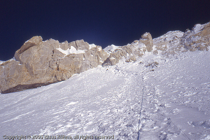 So, das Plateau ist zuende, links runter. Vorsichtig über die Stufen. Endlos abwärts. Um 15h23 ist der obere Hang geschafft. Die Zehen brennen ziemlich – liegt wohl auch an den Plastiktüten im Schuh (meine Vapour-Barrier-Liner sozusagen). Kann leider nicht runterrennen bzw. will nicht das Knie riskieren, schließlich habe ich seit 2002 ein angerissenes Kreuzband. Kaum ein Blick zurück, auch keine große Euphorie. Eher Verwunderung darüber, dass ich tatsächlich oben war. Das Wetter ist immer noch toll. Um 16h15 ist der untere Hang erreicht – immer mit Blick auf Lager 2. Ob sie mich mit dem Fernglas beobachten? Immer noch „above the clouds“. Winzige Punkte auf dem Weg zu Lager 2... Am ersten Fixseil wieder mal das Achterproblem (zuviel Zug auf dem Seil), kann das erste Stück aber frei absteigen, dann den Achter rein und abwärts. Pumpe geht heftig aber es klappt ganz gut. Konzentration bei den Wechseln. Bin allein unterwegs, aber so gefällt’s mir. Jetzt langsam runter zum Gelben Band. Wie wird das gehen? Erst danach ist Entwarnung. Da unten ist es und dann Lager 3. Achtung jetzt! Gerade runter und dann links – alles paletti! 17h05 unterhalb des Gelben Bandes. Ging überraschend easy. Langsam kommt sowas wie Freude auf...