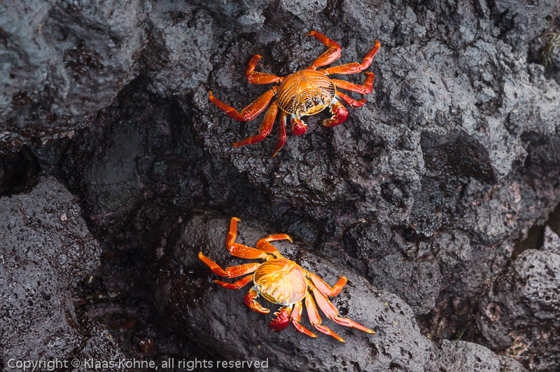 Hier zwei besonders schöne Exemplare. Im Englischen heißen sie "Sally Lightfoot Crab", im Spanischen "Zayapa" und wissenschaftlich "Grapsus grapsus".